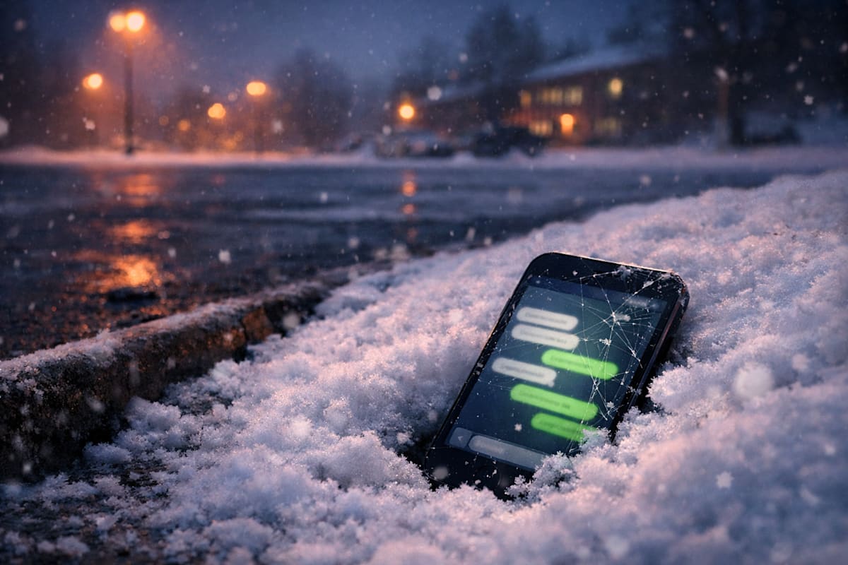 The first clear picture in my head was simple: a cracked smartphone lying face-up in the snow, half buried near a school curb. The screen is spiderwebbed. The cold makes the glass look sharper. A streetlight throws that pale orange glow across the parking lot. Everything feels still, like the world is holding its breath.